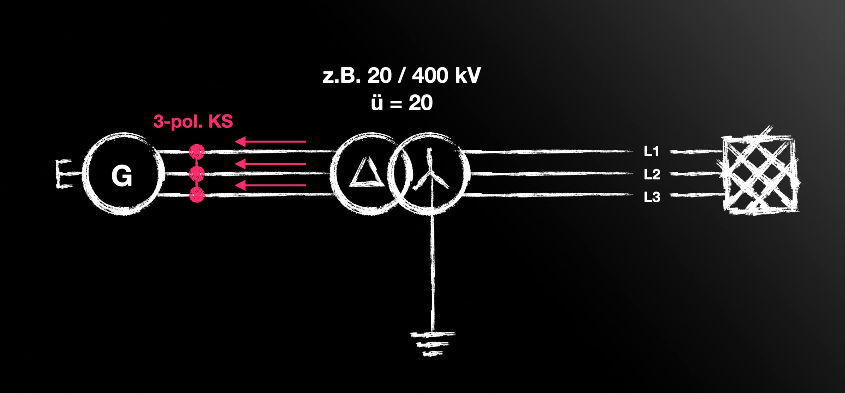 Der dreipolige Kurzschluss auf der Generatorseite wird hier analog auf die Netzseite Seite übertragen und wird ebenfalls als dreipoliger Kurzschluss gesehen. Berechnen können wir den oberspannungsseitigen Strom auch an dieser Stelle wieder einfach, indem wir den unterspannungsseitigen Kurzschlussstrom durch das Übersetzungsverhältnis teilen.
